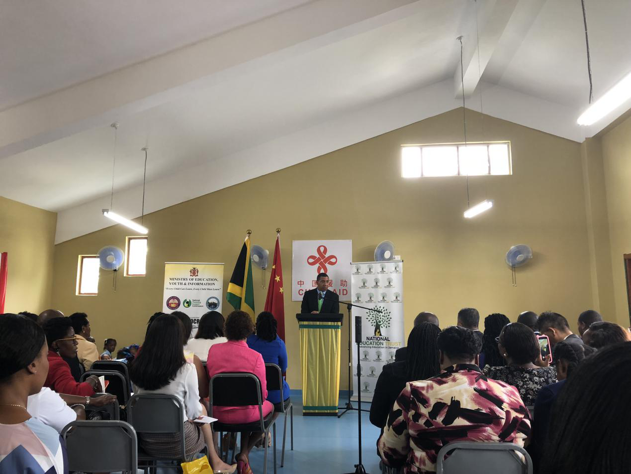 移交仪式由常秘弗朗西斯女士致欢迎词,牙买加教育、青年和新闻部部长参议员鲁尔.里德、常任秘书长邓恩.罗伊.萧伯、国家教育委员会主席参议员马修萨姆达、议会议员弗格森先生、田琦大使和安德鲁·霍尔尼斯总理等分别发表了人情洋溢的讲话。
